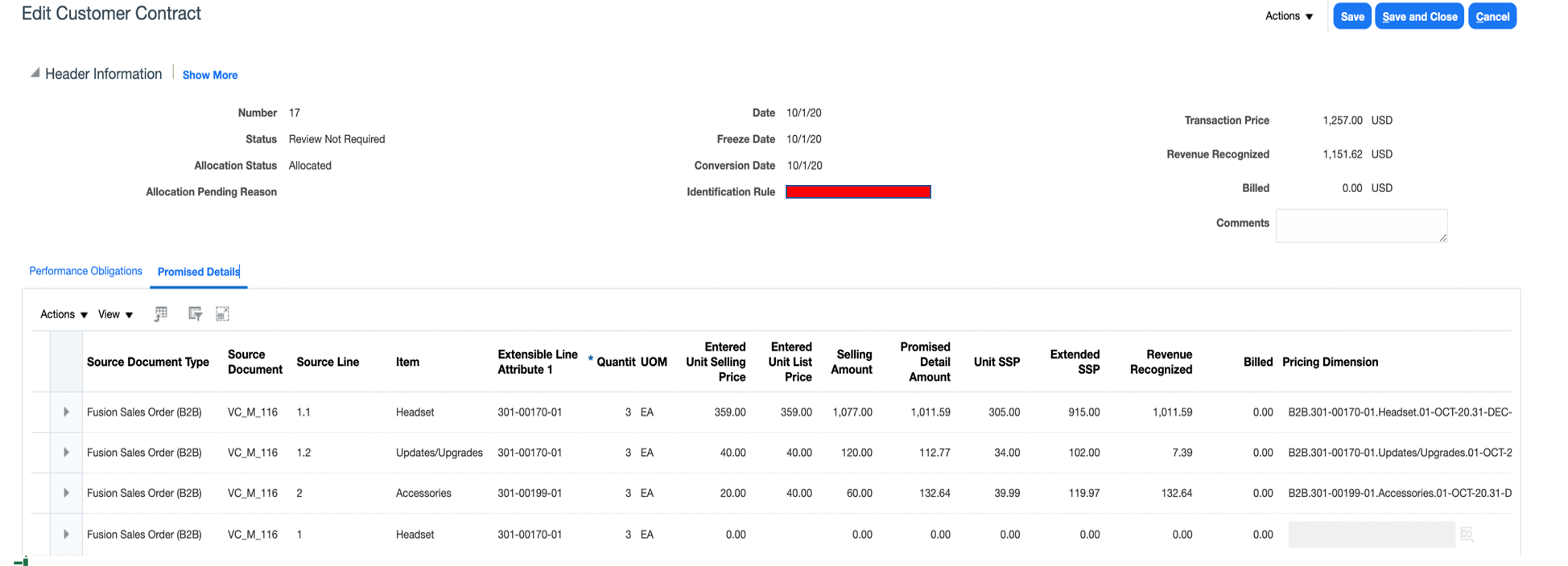 A company sells Bundle Hardware + Services items to partners/distributors in bulk. At the time of inception, a business does not know the actual returns in the future. Business users study the market and come up with a fixed transaction price and revenue for the Item. Revenue Contract created with this consideration may not be accurate as actuals depend on the number of Hardware Activated or Returned. This is known as VC Price and VC Revenue, which depends on future events.