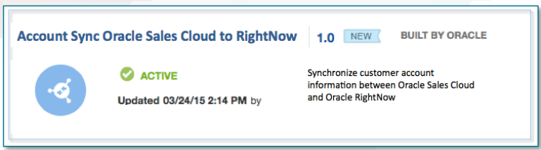 Example of a prebuilt integration sharing data between Oracle Sales Cloud and Oracle RightNow Cloud Service. Prebuilds developed by Oracle display the “Built by Oracle” text.