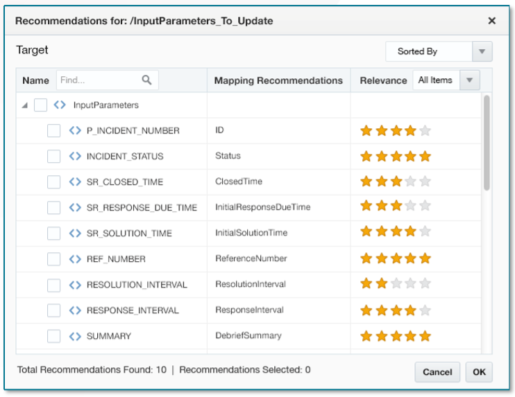 (For example, Account Identifier in one application and AccountID in the other application), The higher the recommendation (relevance) on a scale of 1-5 stars, 5 being the highest. When using the Oracle recommendation option, the Oracle data pair match between two applications is sourced by Oracle. There is no need for the Recommend feature to access customer-specific metadata about the integration. Only the application-specific information is used for Recommendation guidance for future integrations.