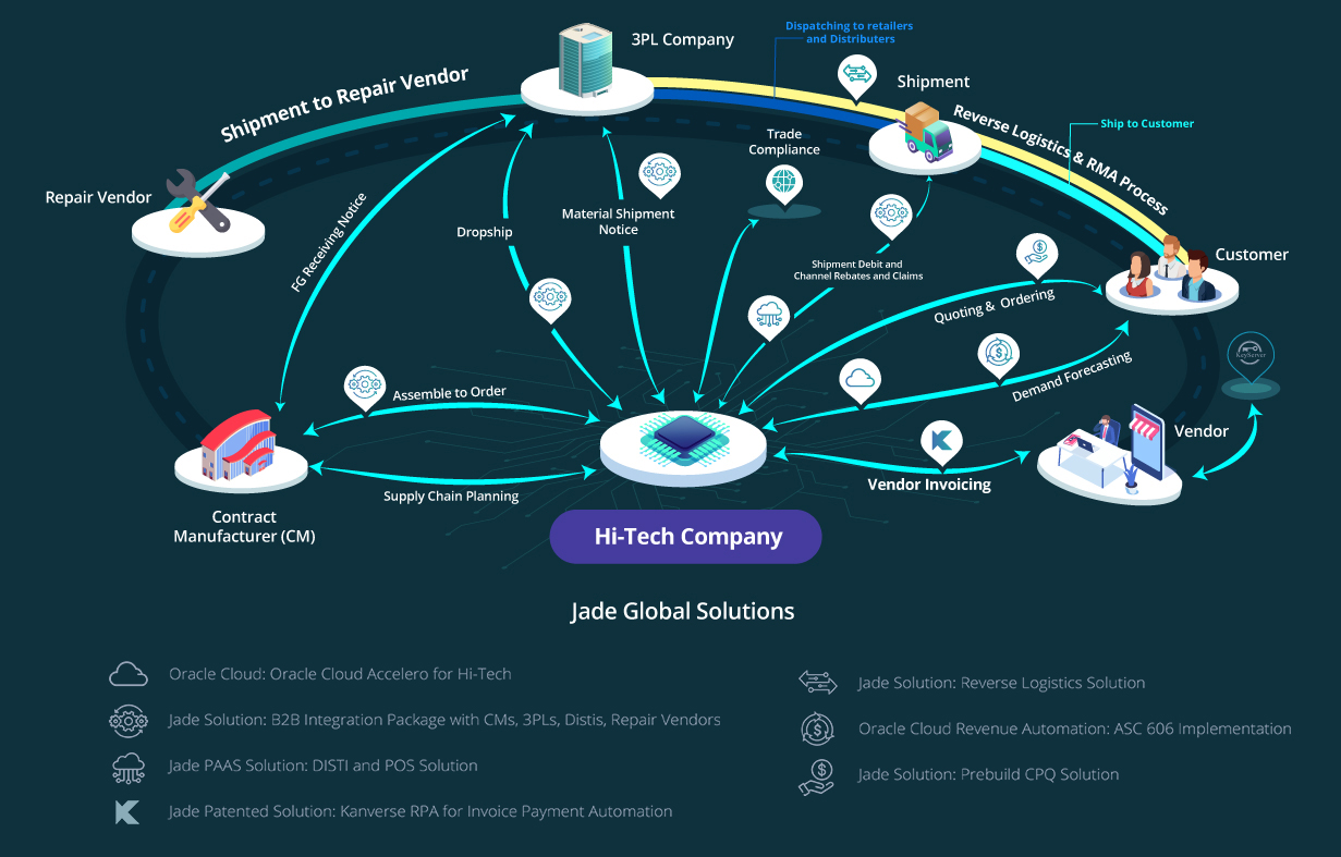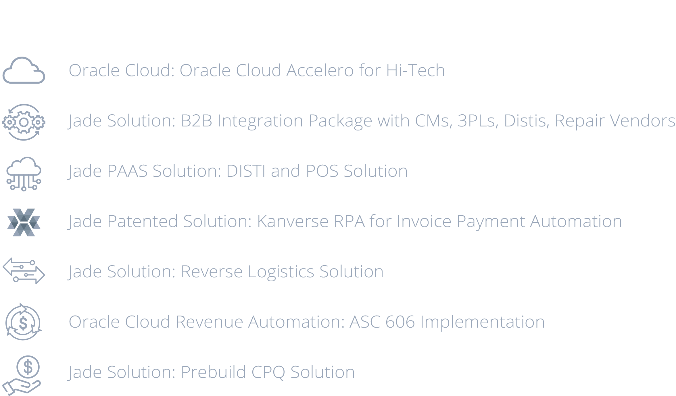 Considering the various key challenges and opportunities in the Hi-tech industry, Jade Global has built a solution precisely to address these issues and help drive your digital transformation journey. Jade Global’s Accelero Solution for Network Devices consists of our Prebuilt ERP: Oracle ERP Cloud and NetSuite, CRM: Salesforce Sales, Revenue Cloud and Service Cloud to enable up to 40% faster implementation cycle. Prebuilt solutions include Preconfigured Business Processes and Metadata.
