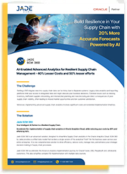 Jade SCM AI Insight is a supply chain management solution by Jade Global, a long-standing Oracle partner. It accelerates the implementation of advanced analytics in Oracle Analytics Cloud by reducing efforts by 50% and costs by 40%. Our AI-powered Oracle SCM solution is the one comprehensive tool to drive efficiency, reduce costs and manage risks in your supply chain processes.
