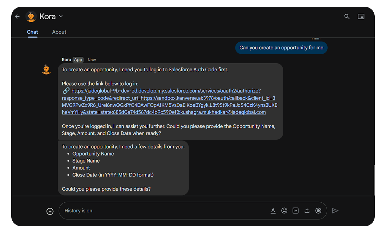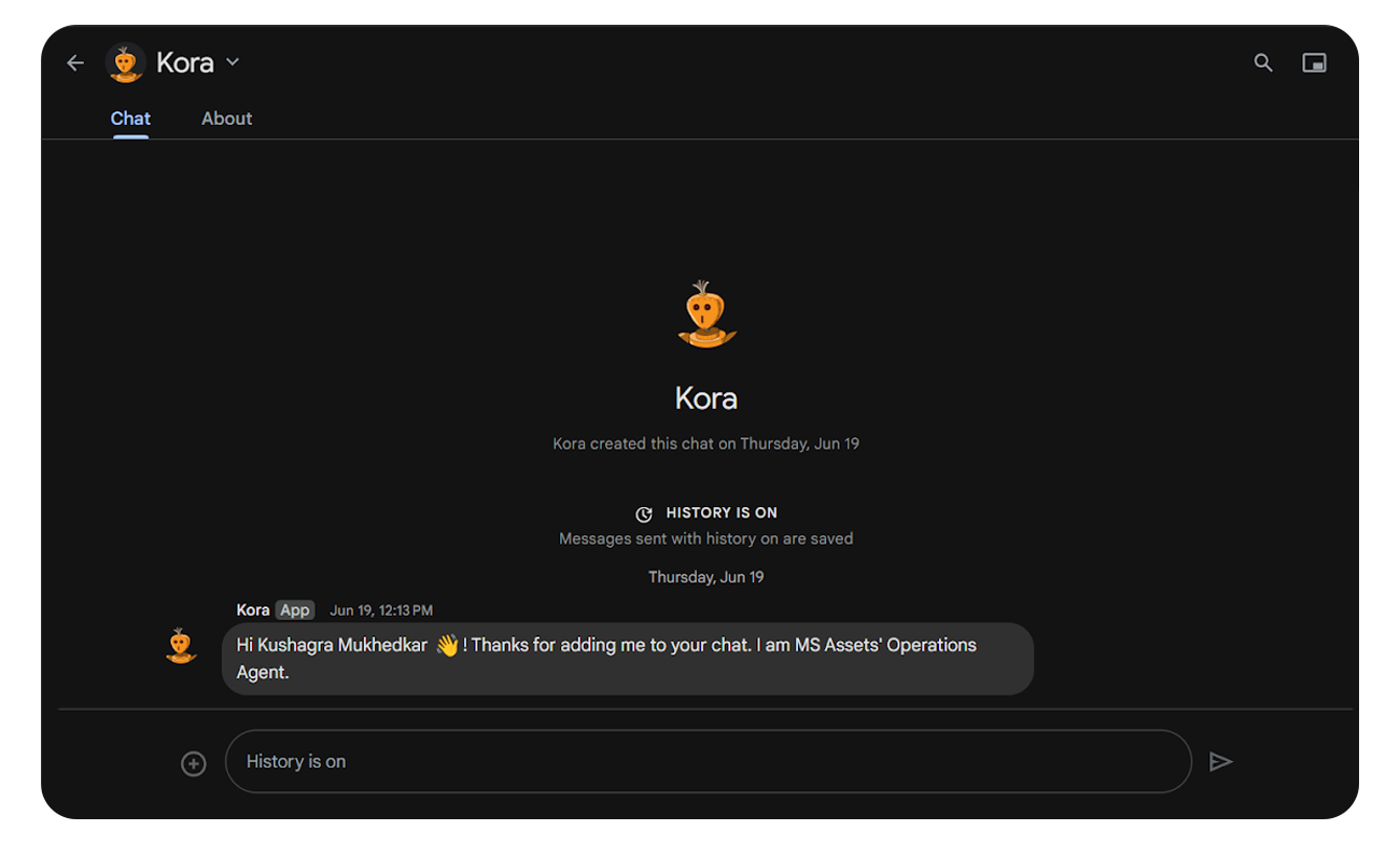 The user types a daily/manual task in their company chat application like Google Chat or MS Teams-something they'd usually do manually in a system.